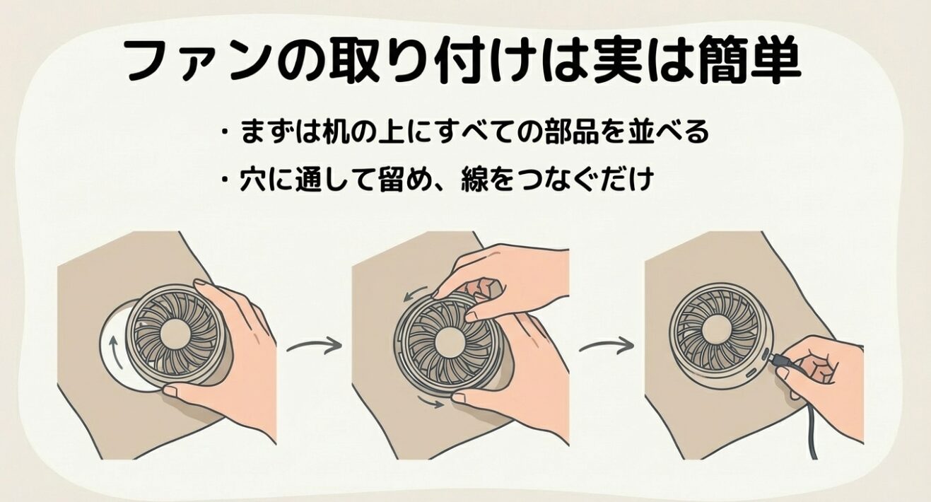 取り付けの体感としては、ファンを穴に通してリングで固定、左右をケーブルでつないで、ケーブルを服の内側で暴れないように留める。この流れさえ押さえればOKです。時間がかかるのは最初だけで、2回目以降は「衣替えの手順」みたいに慣れていくはずです。
