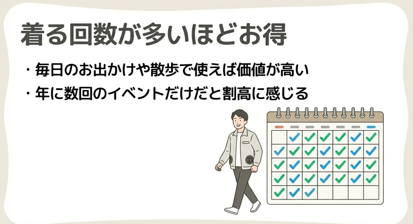 私の感覚だと、KiUは「最強の風量を最安で」よりも、見た目と日常での使いやすさに価値を置くタイプ。だからコスパ判断は、涼しさだけで割り切るより、着る頻度とシーンで考えるのが合っている気がします。たとえば、フェスやキャンプだけで年に数回だと悩みますが、散歩や買い物、通勤の徒歩など、日常でも使うなら“回収”が早いです。