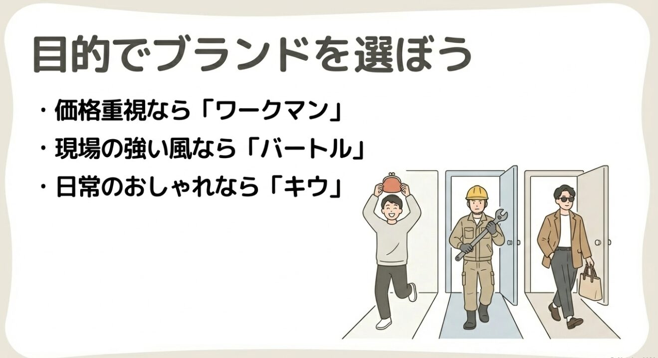 比較対象としてよく名前が出るのが、ワークマンとバートルですよね。ざっくり言うと、ワークマンは「まず試したい・コストを抑えたい」に強く、バートルは「風量や現場寄りの性能を重視」に強い印象です。一方でKiUは、そこに「街で着られるデザイン」という軸を強く足しているタイプ。だから、単純な風量の強さだけで勝負すると話がズレやすくて、どこでどう着たいかが比較の中心になります。