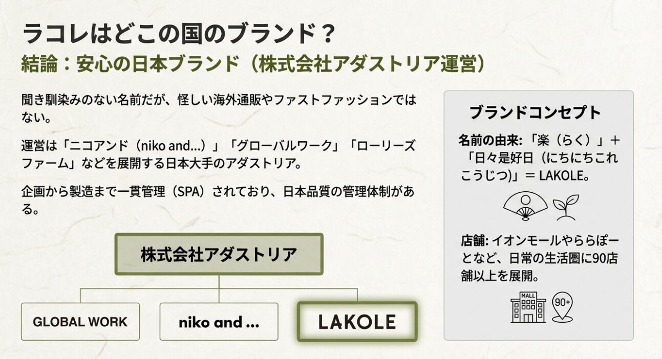 アダストリアは、ショッピングセンター(SC)を中心に店舗展開を得意とする企業で、企画から製造、販売までを一貫して行うSPA(製造小売業)という業態をとっています。ラコレもその強固なサプライチェーンを活用しているため、日本品質の企画力と管理体制の下で商品が作られています。決して「どこの誰が作ったかわからない怪しい服」ではありません。