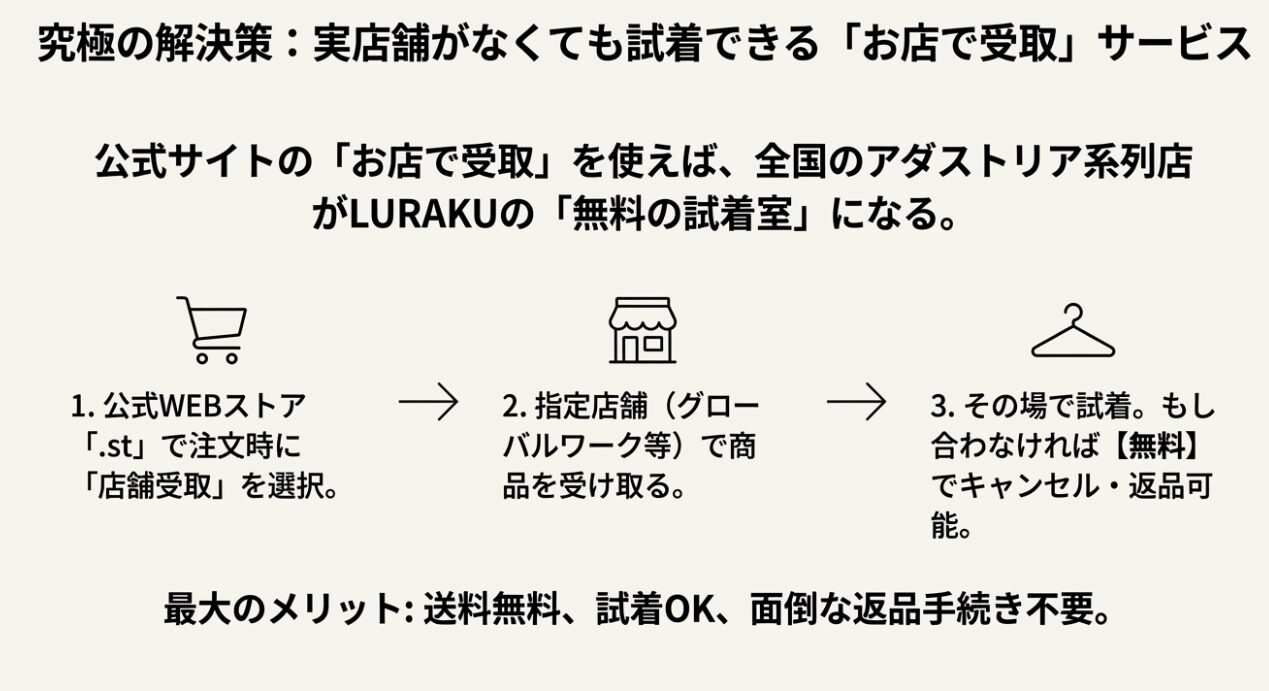 「じゃあ、一か八かでネット注文するしかないの?」と思ったあなた、諦めるのはまだ早いです。ここで、アダストリアグループの強みを最大限に活かした裏技をご紹介します。それが「お店で受取」サービスです。