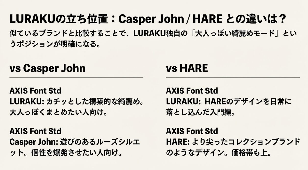 LURAKUを検討している方は、よく似た雰囲気を持つ他のブランドとも迷われていることでしょう。特に比較対象となりやすいのが「Casper John(キャスパージョン)」と「HARE(ハレ)」です。それぞれの違いを整理して、あなたが選ぶべきブランドを明確にします。