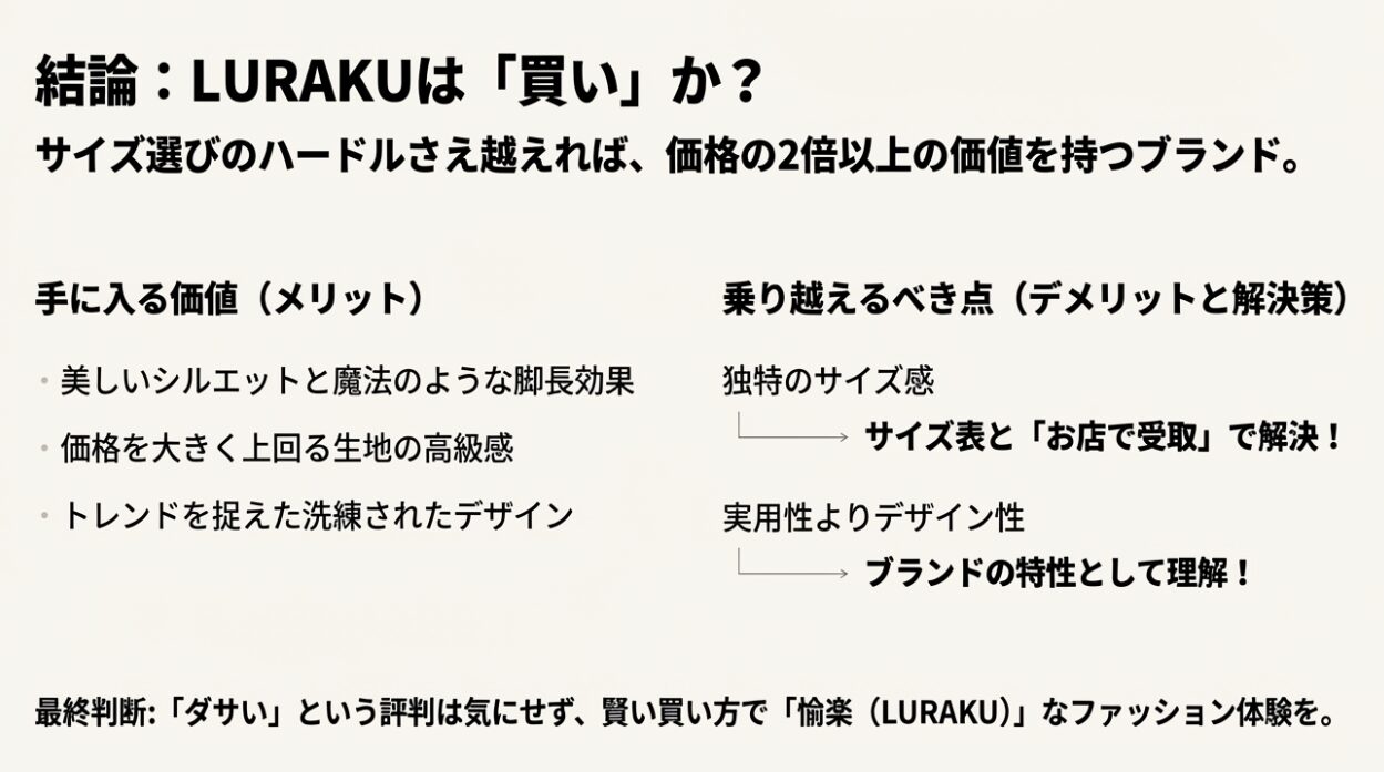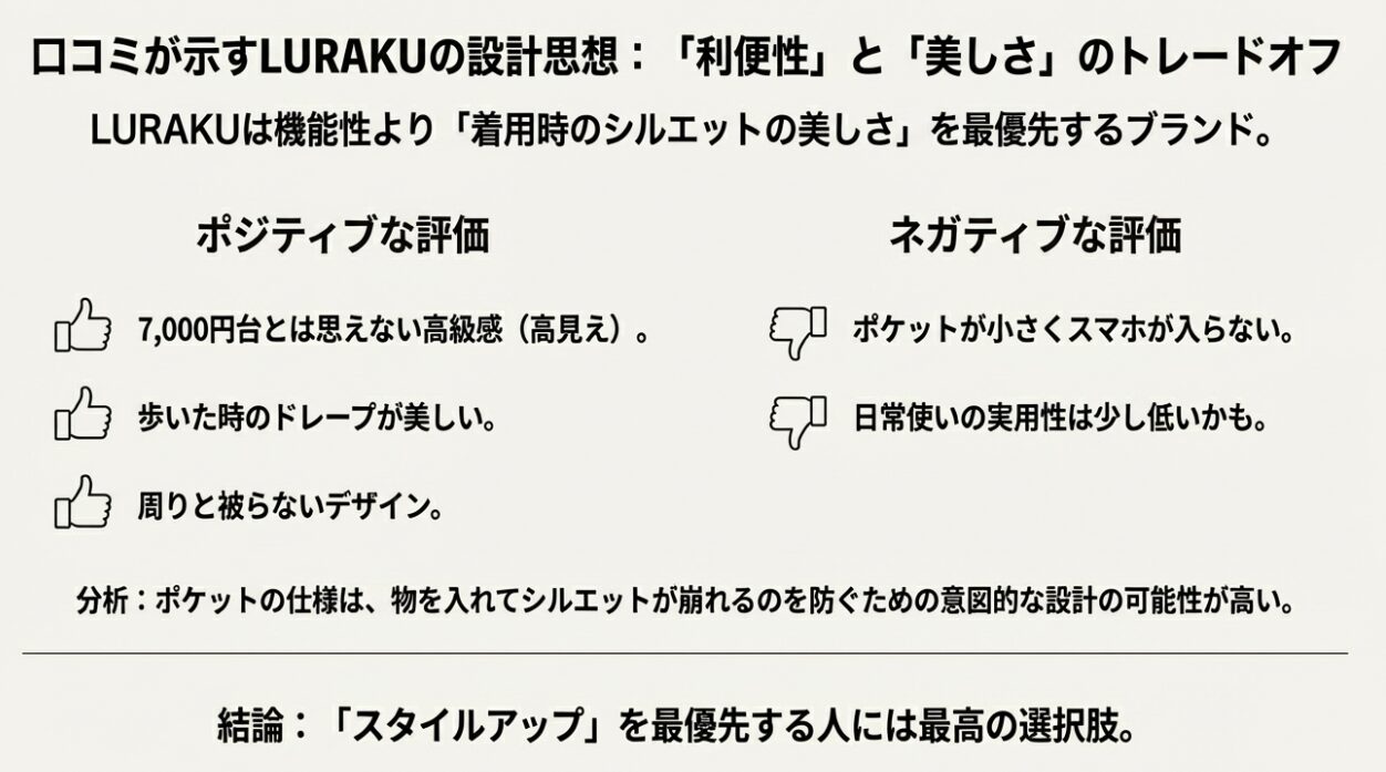 つまり、LURAKUは「利便性」よりも「着た時の美しさ・スタイルアップ」を最優先に考える人にとっては最高のブランドですが、「機能性」を最優先する人にとっては、少し使い勝手が悪いと感じるかもしれない、ということです。この特性を理解していれば、「ダサい」という評判に惑わされることはないでしょう。