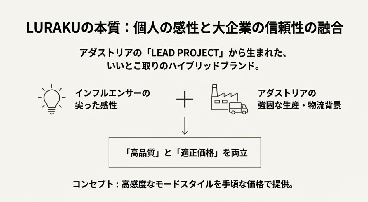 LURAKUは、グローバルワークやニコアンドなどを展開する大手アパレル企業、株式会社アダストリアが推進する「LEAD PROJECT」から2024年6月にローンチされたブランドです。