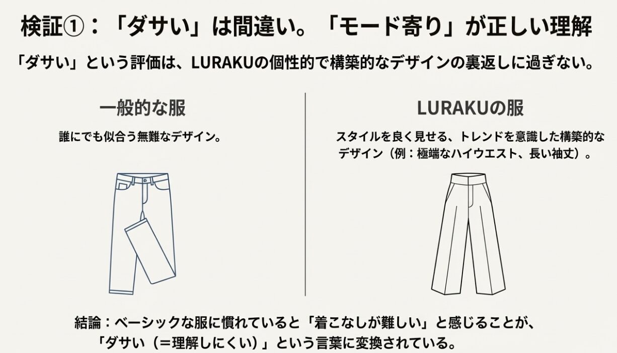 まず、検索候補に出てくる「ダサい」という言葉について検証していきましょう。これから着ようと思っているブランドがダサいと言われていたら、誰だって不安になりますよね。しかし、結論から言うと、この評価はLURAKUのデザインが「モード寄り」で個性的であることの裏返しであり、決して「カッコ悪い」という意味ではありません。