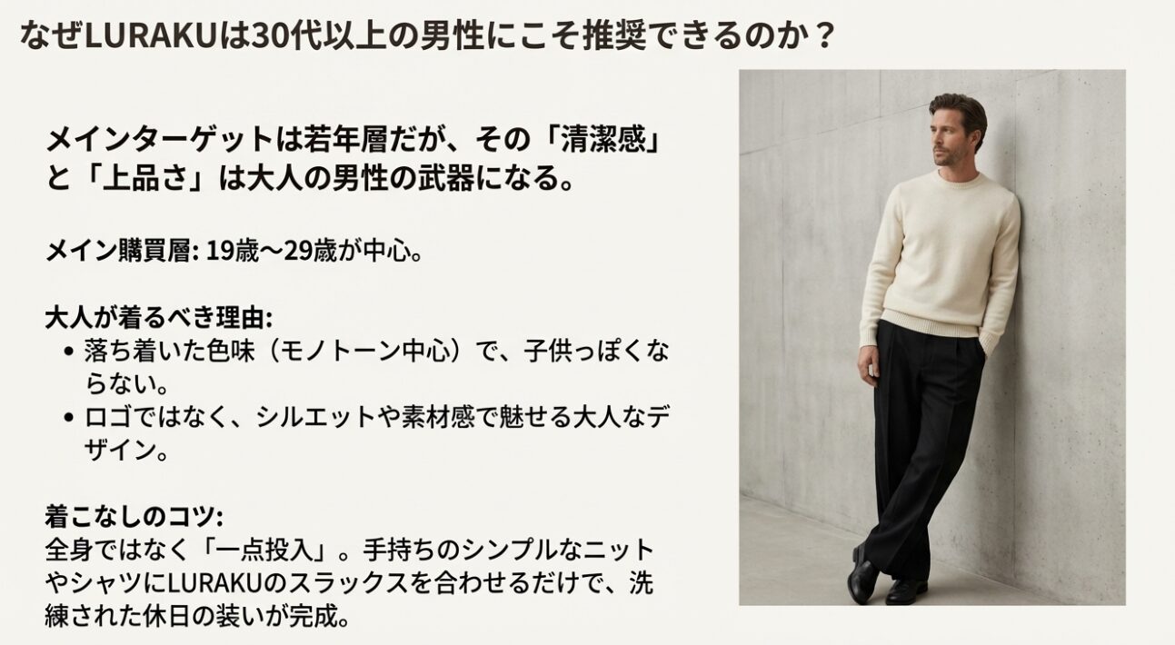 30代以上の方が取り入れる際は、「全身LURAKU」で固めてモード全開にするよりも、一点投入がおすすめです。例えば、ボトムスだけLURAKUのきれいめスラックスを選び、トップスにはお手持ちのシンプルな白シャツや上質なニットを合わせる。これだけで、ぐっと洗練された「大人の休日スタイル」が完成します。