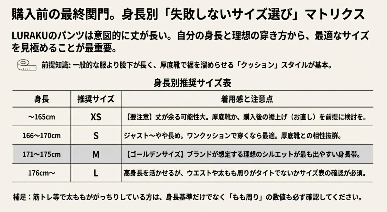 そのため、「普段Mサイズを買っているから、LURAKUもMで大丈夫だろう」という安易な感覚で選ぶと、確実に「丈が長すぎて引きずる」という事態に陥ります。これが、低身長の方や、フラットなスニーカーを好む方からの「サイズが合わない」という不満の声に繋がっているのです。