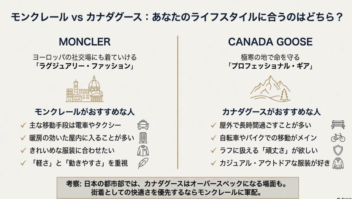 - カナダグースやタトラスなど、比較されがちな競合ブランドとの違いを明確にし、あなたのライフスタイルに最適な一着を見極める方法