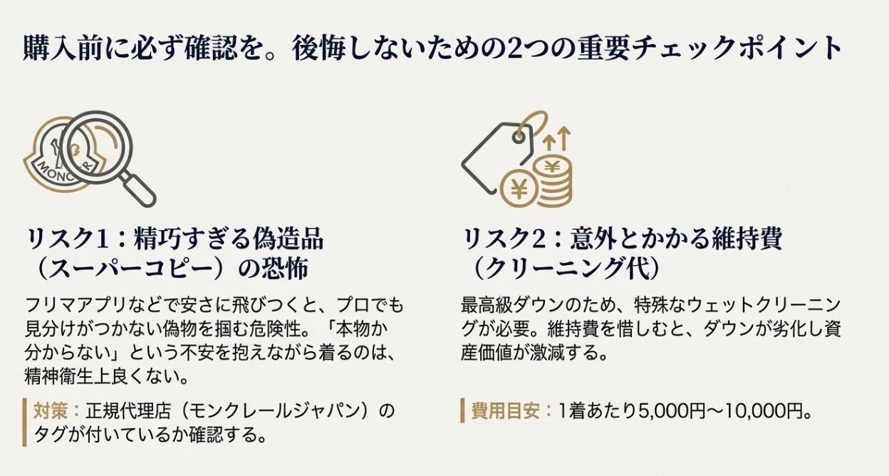 「よし、思い切って買おう!」と決心したあなたに、これだけは絶対に伝えておきたい注意事項があります。高い買い物だからこそ、失敗は許されません。特に注意すべきは「偽物のリスク」と「ランニングコスト」の二点です。