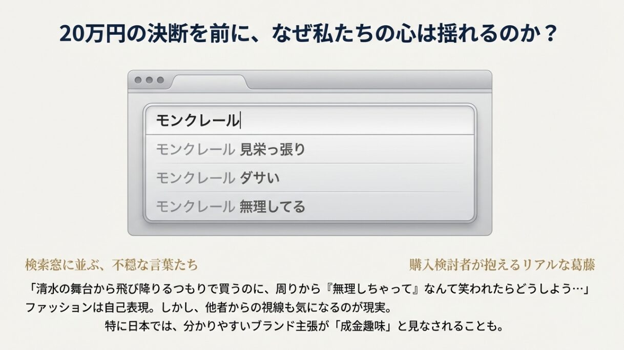 私自身、初めてモンクレールを手に入れようとした時は、そんな葛藤の連続でした。ファッションは自己表現ですが、同時に他者からの視線も気になってしまうのが人間というもの。
