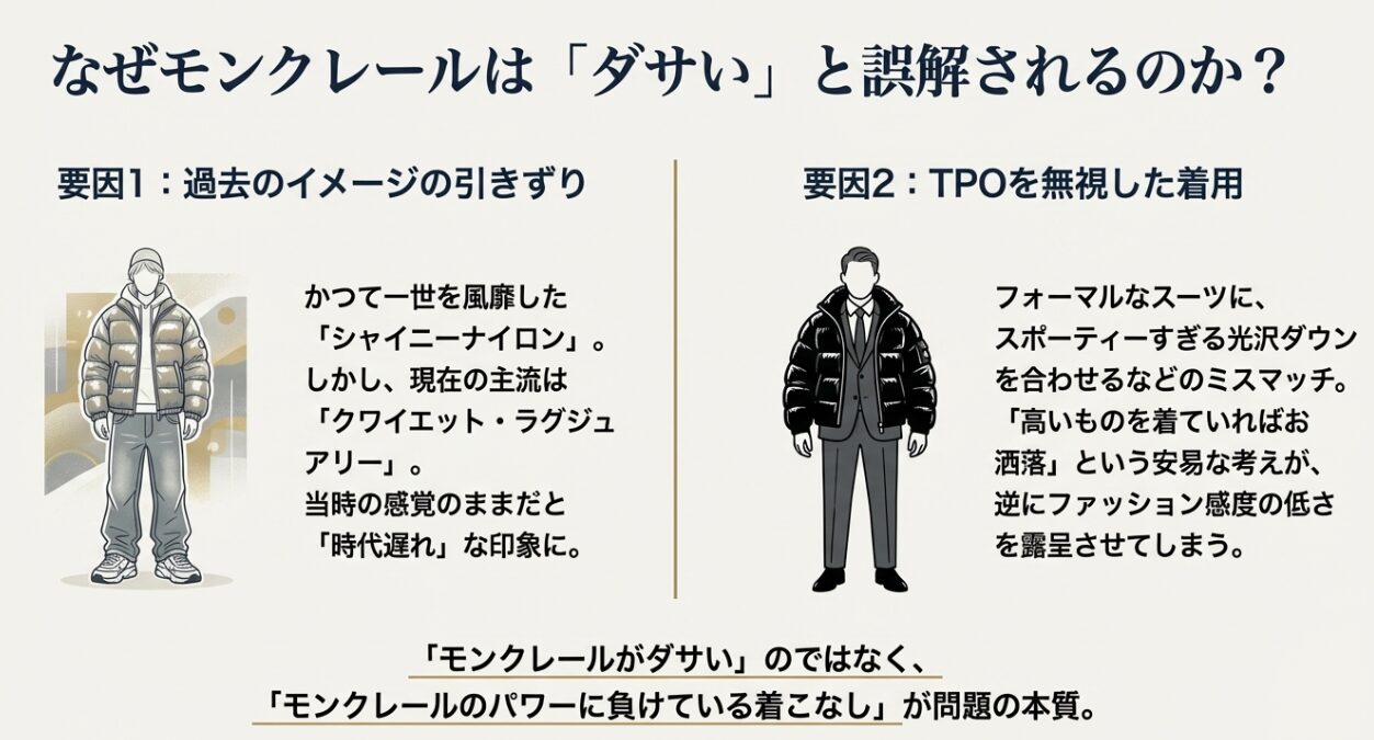 まず直視しなければならないのが、「モンクレール=ダサい」という辛辣な意見です。これには大きく分けて二つの要因があると考えられます。一つは「過去のイメージの引きずり」、もう一つは「TPOを無視した着用」です。