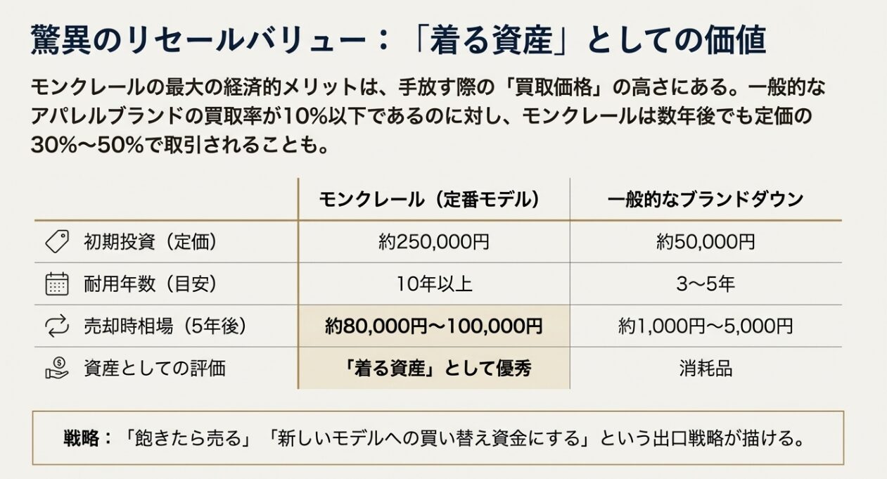さらに特筆すべきは、手放す際の「買取価格」の高さです。モンクレールは中古市場での需要が圧倒的に高く、状態が良い定番モデルであれば、購入から数年経っていても定価の30%〜50%程度で買い取られることが珍しくありません。これは、一般的なアパレルブランドの買取率が定価の10%以下(ファストファッションならほぼ0円)であることを考えると、異常とも言える数値です。
