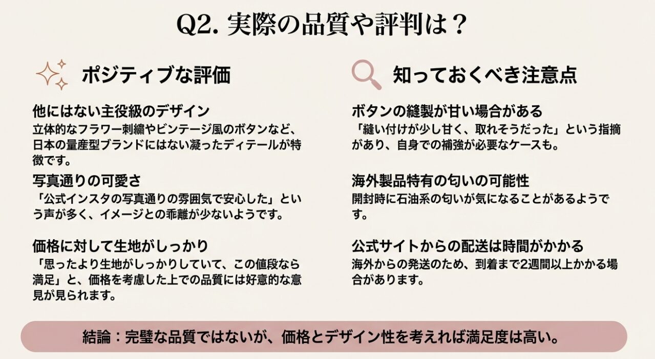 総合的に見ると、「数万円するハイブランドのような完璧な縫製品質ではないが、数千円〜1万円程度の価格帯で、他にはないデザイン性の高い服を楽しめるブランド」として、ユーザーからは概ね好意的に受け入れられています。商品自体は「大丈夫」ですので、過度な心配は不要です。