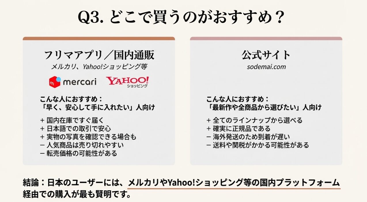公式サイト(sodemai.com)から直接購入することも可能ですが、海外サイトとなるため、「送料が高い」「到着まで時間がかかる」「関税の手続きが不安」「返品交換のハードルが高い」といった、個人輸入特有のハードルがあります。
