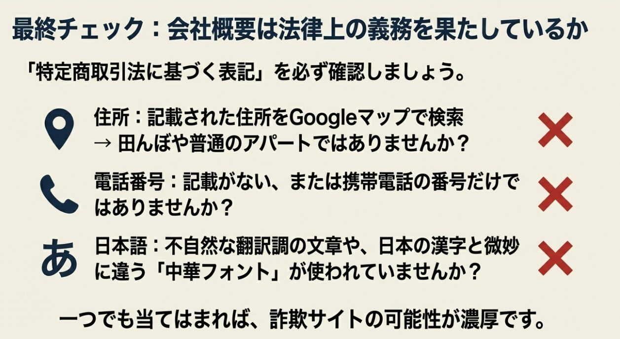 怪しいサイトに遭遇した際、最終的な判断を下すために確認してほしいのが「特定商取引法に基づく表記」や「会社概要」のページです。日本の法律では、通信販売を行う事業者に対して、住所、電話番号、運営責任者名の明示を義務付けています。