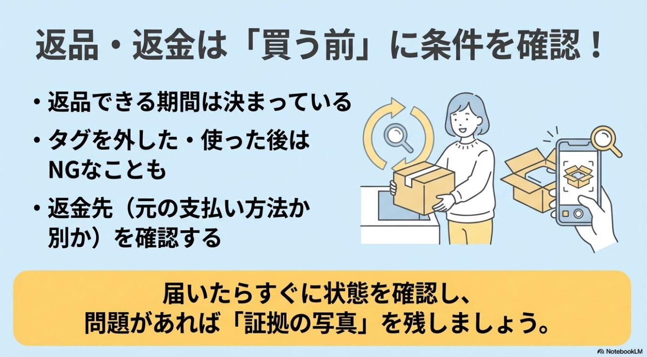 返品や返金は「できるらしい」ではなく、「自分の注文条件でどうなるか」を確認するのがコツです。特に返金先が元の支払い方法なのか、別の形なのかは事前に見ておきたいポイントです。