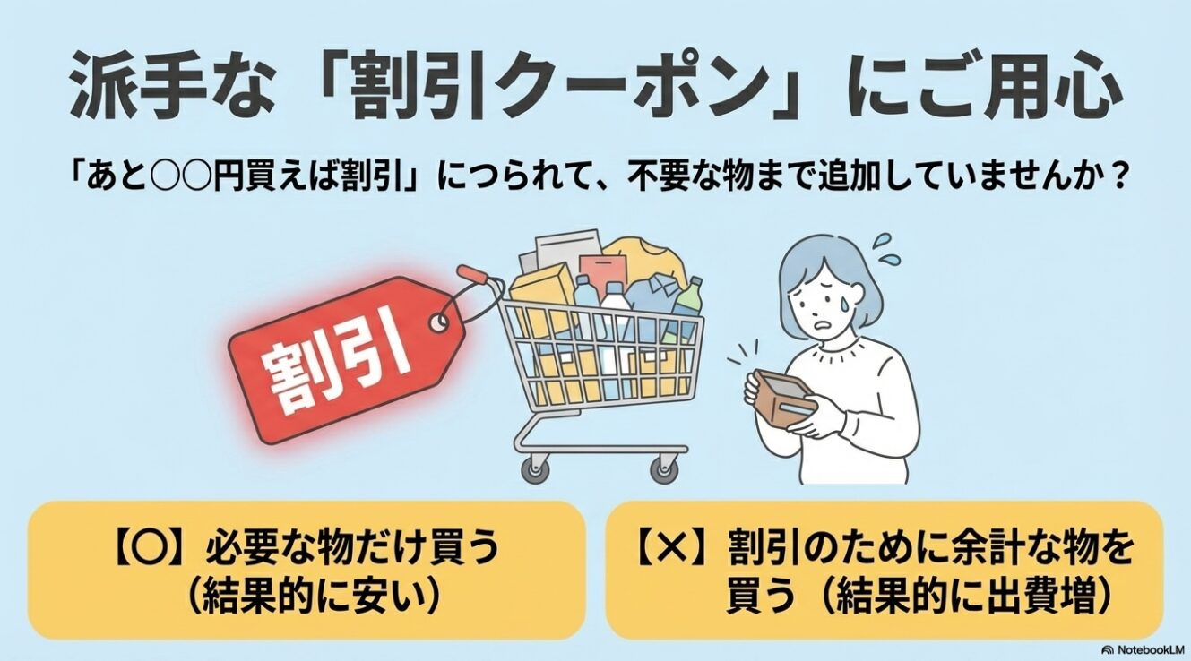 割引のために不要な物まで買って出費が増えることへの注意喚起