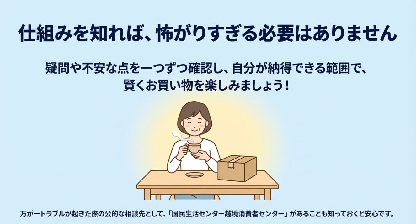 特に、肌に直接触れるもの、口に入る可能性があるもの、子ども向け用品などは、価格だけで飛びつかないほうが安心です。安いから試しやすい反面、失敗したときの影響が大きい商品カテゴリもあるからです。越境取引全般で困ったときは、国民生活センターの越境消費者センターが相談窓口を案内していますので、困った際の公的な相談先として知っておくと安心です。(出典:国民生活センター越境消費者センター(CCJ)