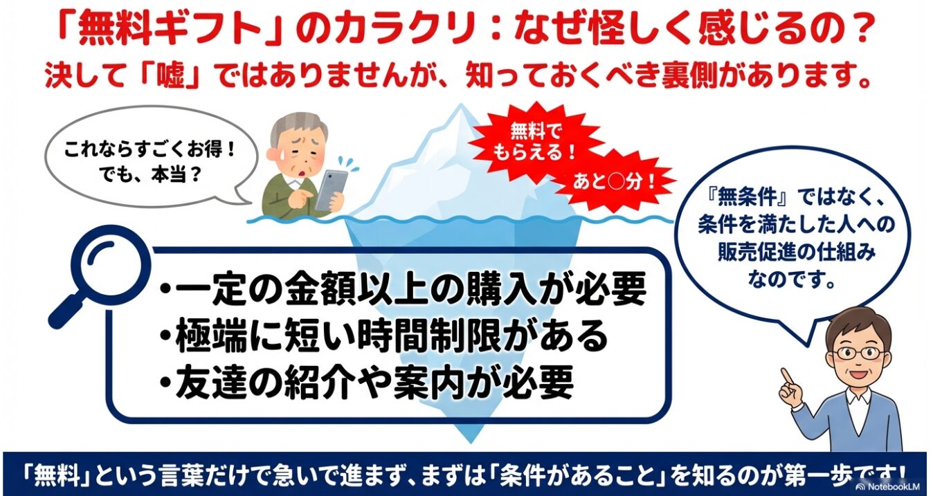 無料ギフトは無条件ではなく一定額の購入や時間制限などの条件がある仕組みの図解