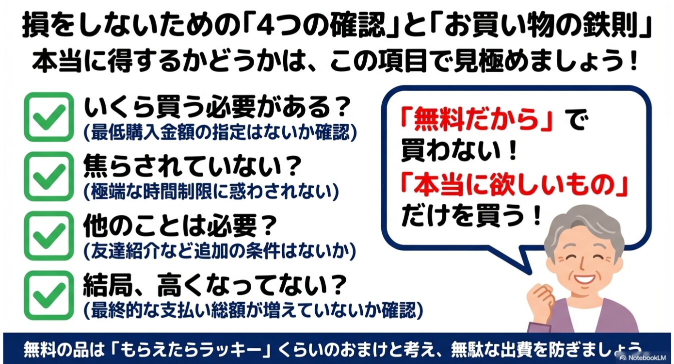 無料ギフトは「本当にもらえるか」だけでなく、「その条件でも必要な買い物か」を基準に考えると、無駄な出費を防ぎやすくなります。