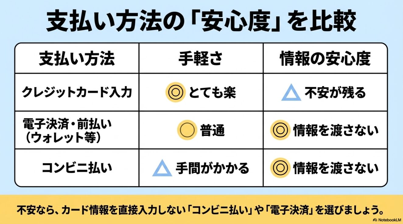 テムでは複数の支払い方法が用意されていますが、個人的には、情報を直接渡しすぎない方法を優先するのが安心かなと思います。たとえば、コンビニ払い、PayPal系、ウォレット系、プリペイド系などは候補にしやすいです。