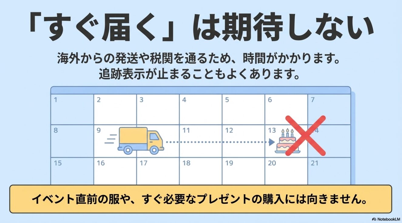 配送日数はあくまで一般的な目安です。時期、地域、通関状況、注文内容によって変動しやすいので、日程に余裕を持って利用したほうが安心です。特にプレゼントや使用日が決まっているものは慎重に考えたいです。