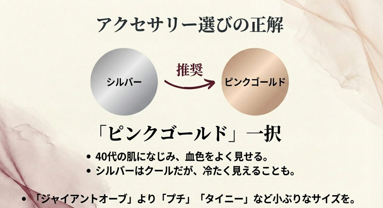 若い頃はクールなシルバーや、パンク色の強いガンメタルを選んでいた方も多いと思いますが、40代以降の女性には断然「ピンクゴールド」がおすすめです。なぜなら、年齢とともに変化する肌のトーンに対して、ピンクゴールドは日本人の肌に非常に馴染みやすく、シルバーよりも柔らかく上品な印象を与えてくれるからです。イエローゴールドほど派手にならず、程よい血色感をプラスしてくれるので、顔まわりがパッと明るく若々しく見えます。