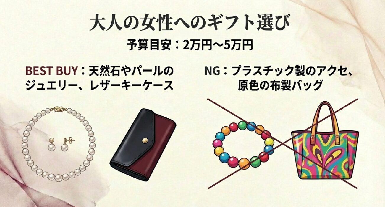 狙い目は、2万円台後半〜3万円台の「天然石やパールを使った華奢なデザインのジュエリー」や「シンプルなレザーのキーケース・カードケース」です。特にパールネックレスに小さなオーブが付いているデザインは、フォーマルさと遊び心が同居しており、大人の女性に大人気です。