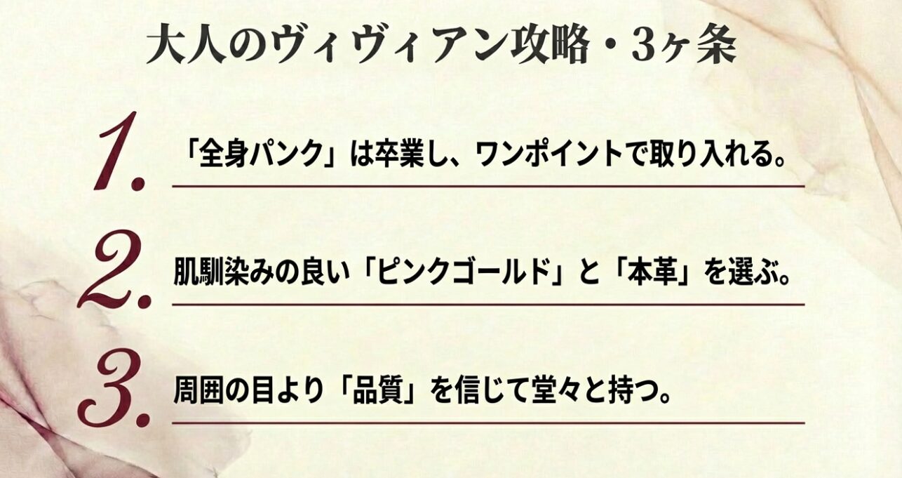 では、なぜ一部で「痛い」と言われてしまうのか。それは「TPOとコーディネートのバランス」の問題です。40代で全身を安全ピンやボンテージファッションで固めれば、確かに日常の場では浮いてしまうでしょう。しかし、上質なウールのコートにさりげなくオーブのボタンがあしらわれていたり、シンプルな黒のワンピースにピンクゴールドのプチオーブネックレスを合わせたりするスタイルは、むしろ「大人の遊び心」として高く評価されます。「反抗」ではなく「自立した精神」として身につけるヴィヴィアンは、痛いどころか、とても格好良い選択だと私は思います。