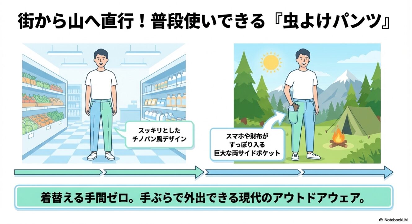 「DIAGUARD(ディアガード)」による確かな防虫性能と、熱中症を防ぐ計算され尽くしたメッシュ構造。バッグを持ち歩く必要がなくなる圧倒的な収納力。そして、街着としても全く違和感のないチノパンツスタイルの洗練されたデザイン。これだけの機能がギュッと詰まっていながら、2,000円台という破格の値段で買えてしまうのは、価格破壊と言っても過言ではありません。