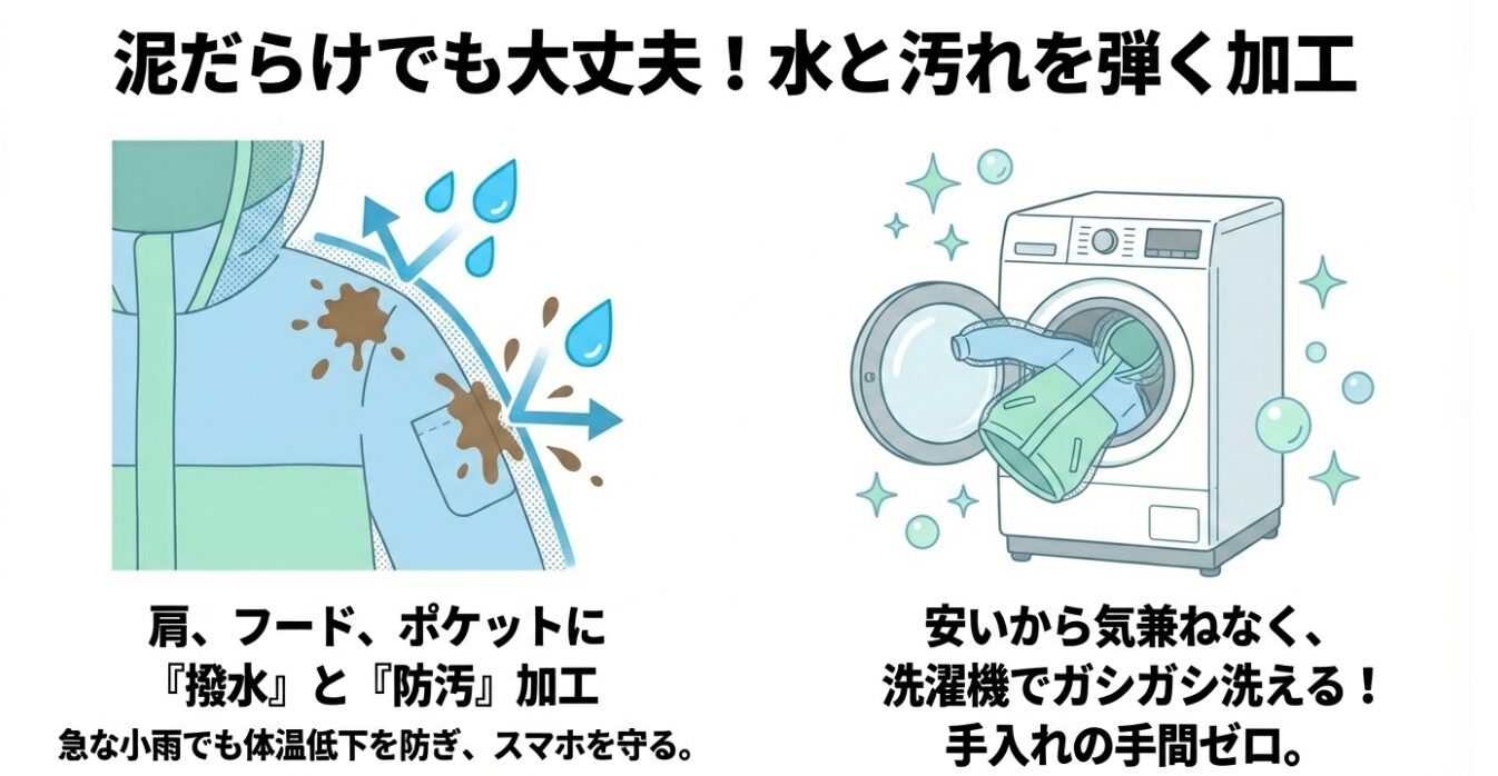 さらに嬉しいのが、この加工が水を弾くだけでなく「汚れも弾く」防汚機能も兼ね備えている点です。泥はねや土の汚れが繊維の奥まで染み込みにくいため、キャンプやガーデニングで泥だらけになっても、少量の水でサッと洗い落とすことができます。「安いから気兼ねなく洗濯機で洗える」「手入れに手間がかからない」というメンテナンス性の高さは、忙しい現代のライフスタイルにぴったりマッチしており、口コミでも非常に高く評価されている重要ポイントです。